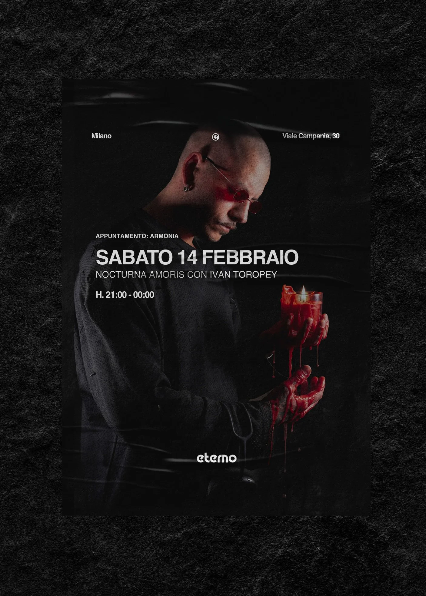 In occasione di San Valentino, Ivan Toropey dà forma a NOCTURNA AMORIS, un rito sonoro dedicato alla connessione. Un flusso di melodie profonde e pulsazioni avvolgenti attraversa la notte, plasmando uno spazio in cui le frequenze si cercano, si riconoscono e si accordano nella stessa energia. Nella penombra, l’incontro non è casuale: è vibrazione condivisa, presenza che si sfiora, tensione sottile che diventa esperienza.